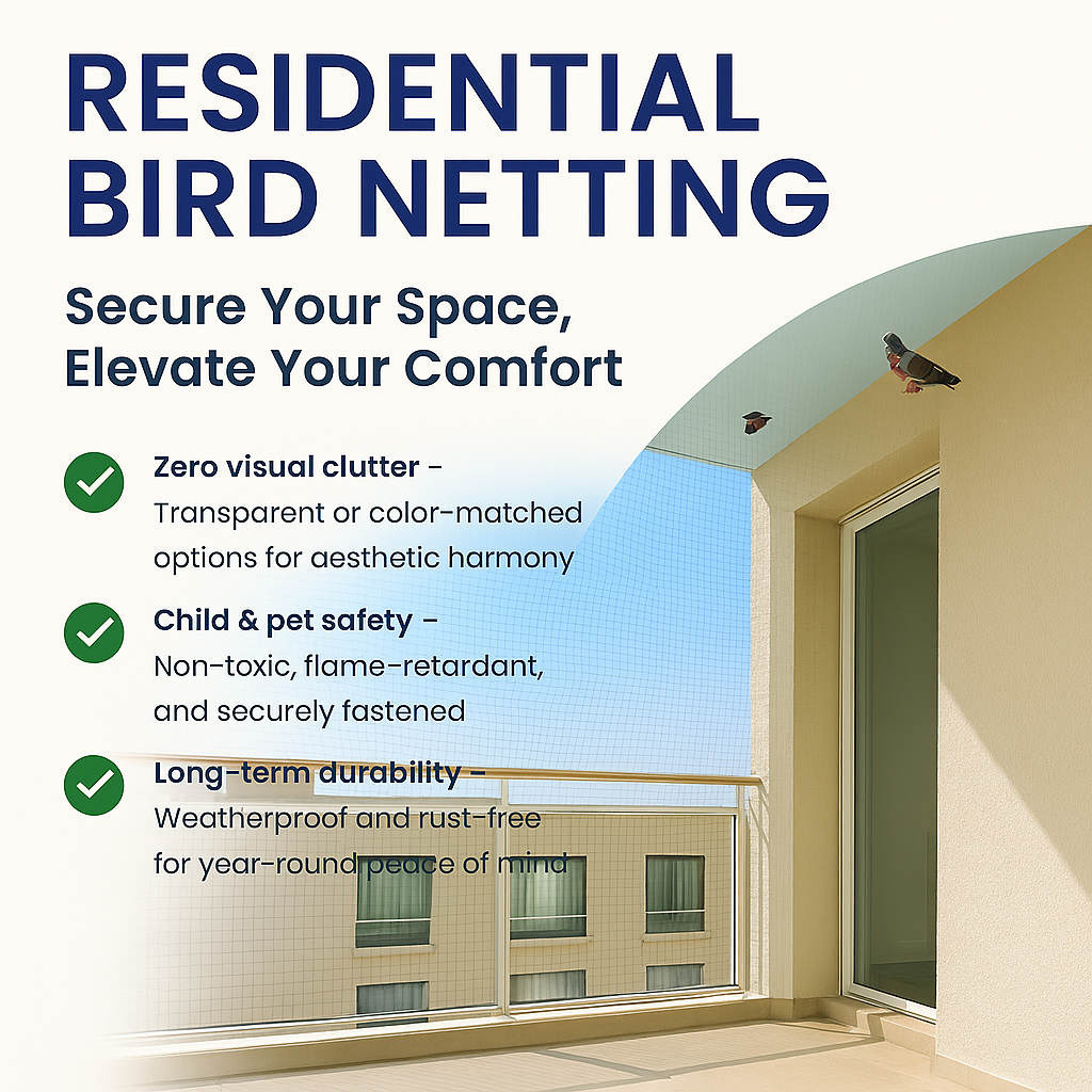 Say goodbye to unwanted bird intrusions and hello to a cleaner, safer home environment. Our residential bird netting service offers discreet, durable protection for balconies, windows, ducts, and open areas—without compromising your view or ventilation.